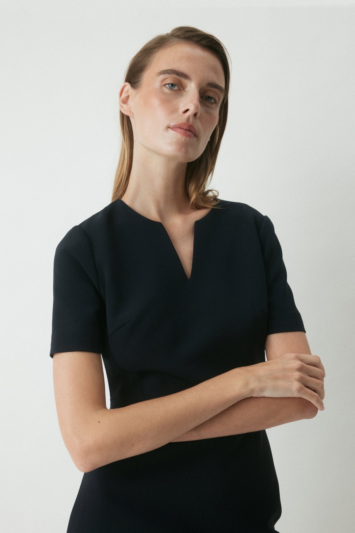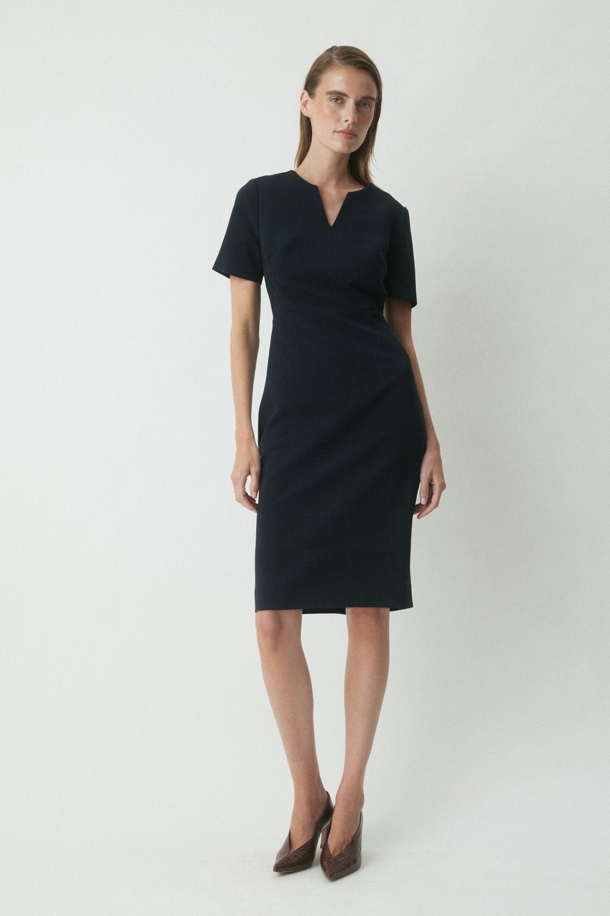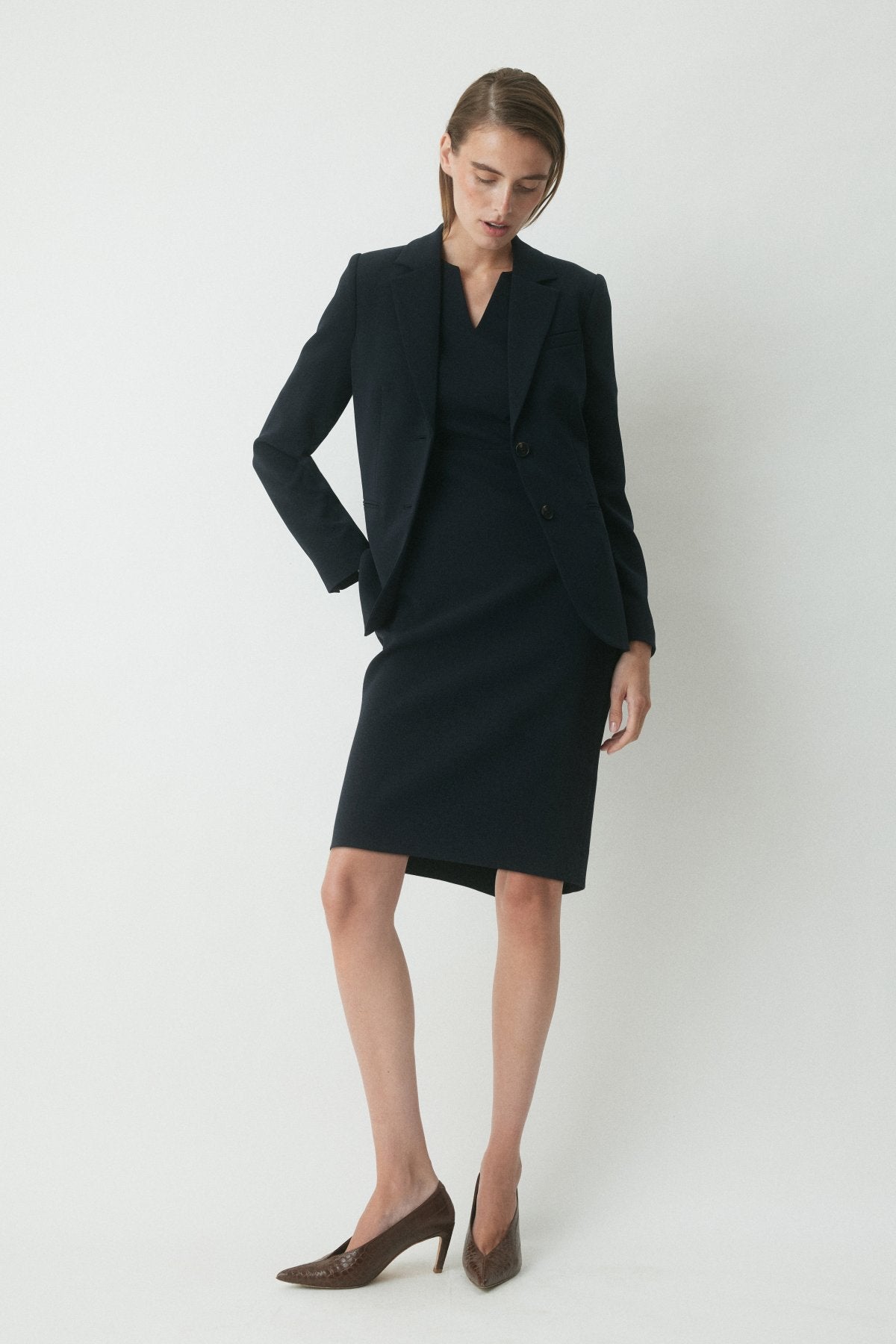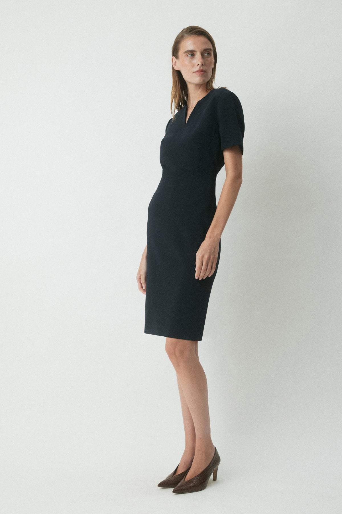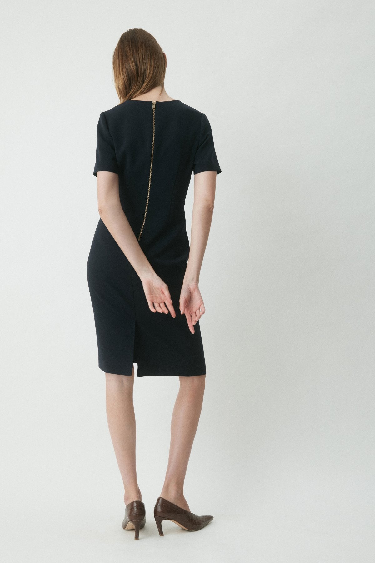 The Crawford Dress is a modern workwear staple, crafted from premium Japanese matte suiting in a tailored silhouette. With a structured V neckline and pencil skirt shape, it’s finished with an exposed gold zip and back vent for ease of movement.