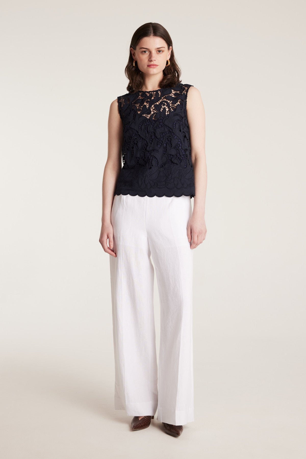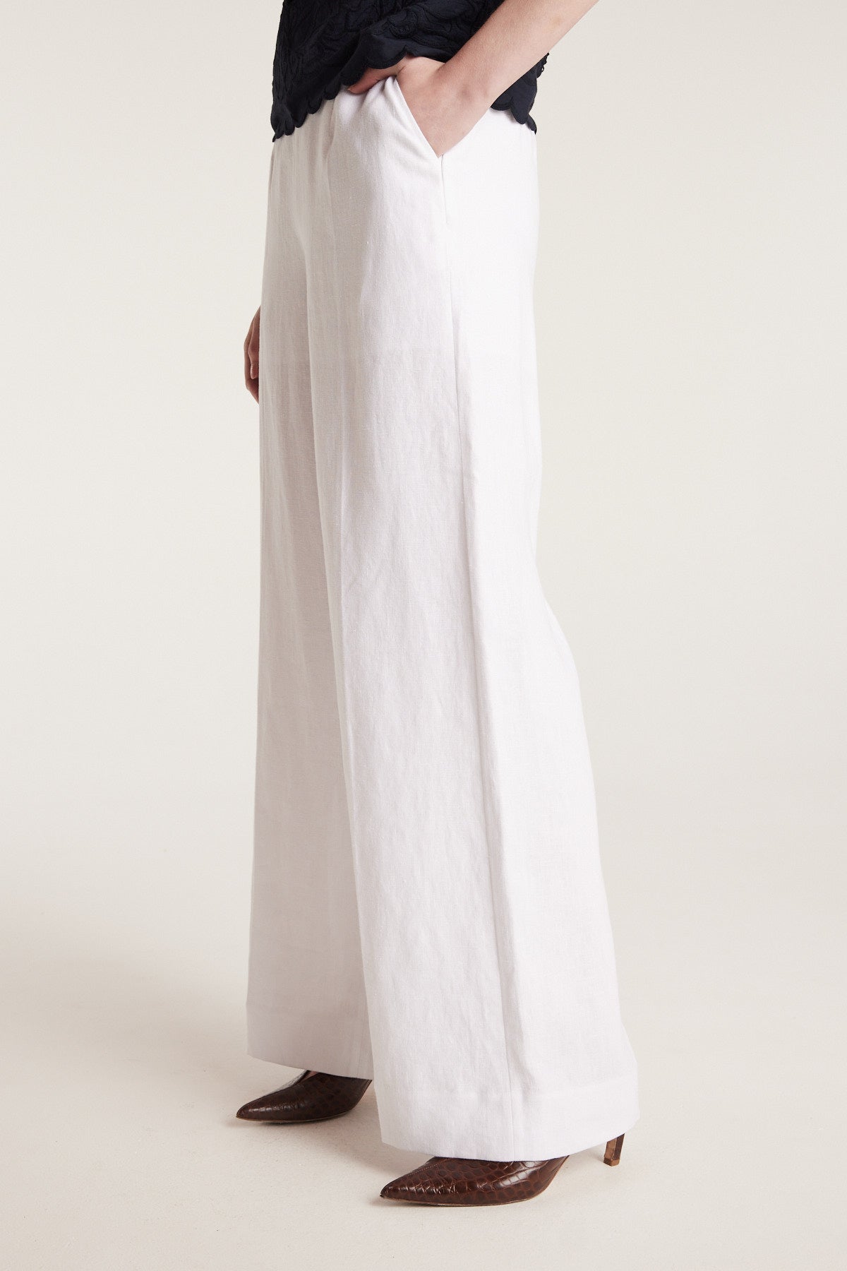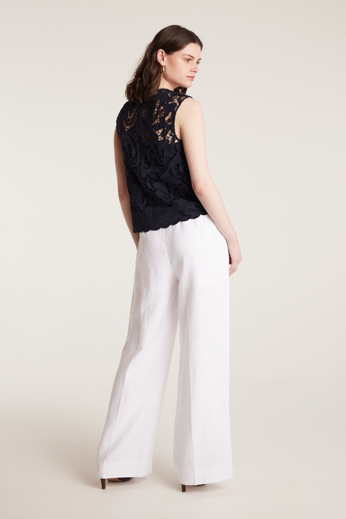 The Tailored Linen Pant is crafted from 100% linen and cut in a wide leg silhouette for effortless refinement. With a high-rise waist, dart detailing and pressed creases, it offers a polished yet breathable option for warmer days.
